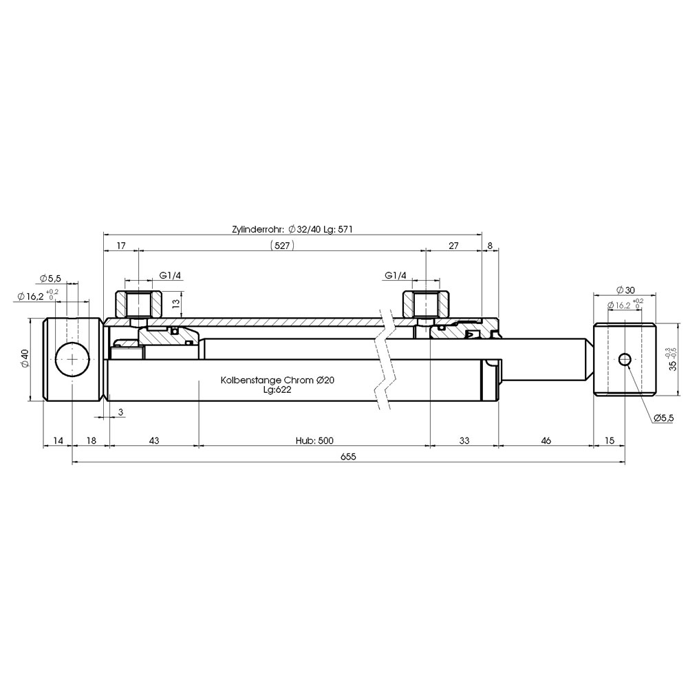 Hydraulikzylinder doppeltwirkend - Hub 500mm, Druckkraft ca. 1,6 Tonnen, 200bar