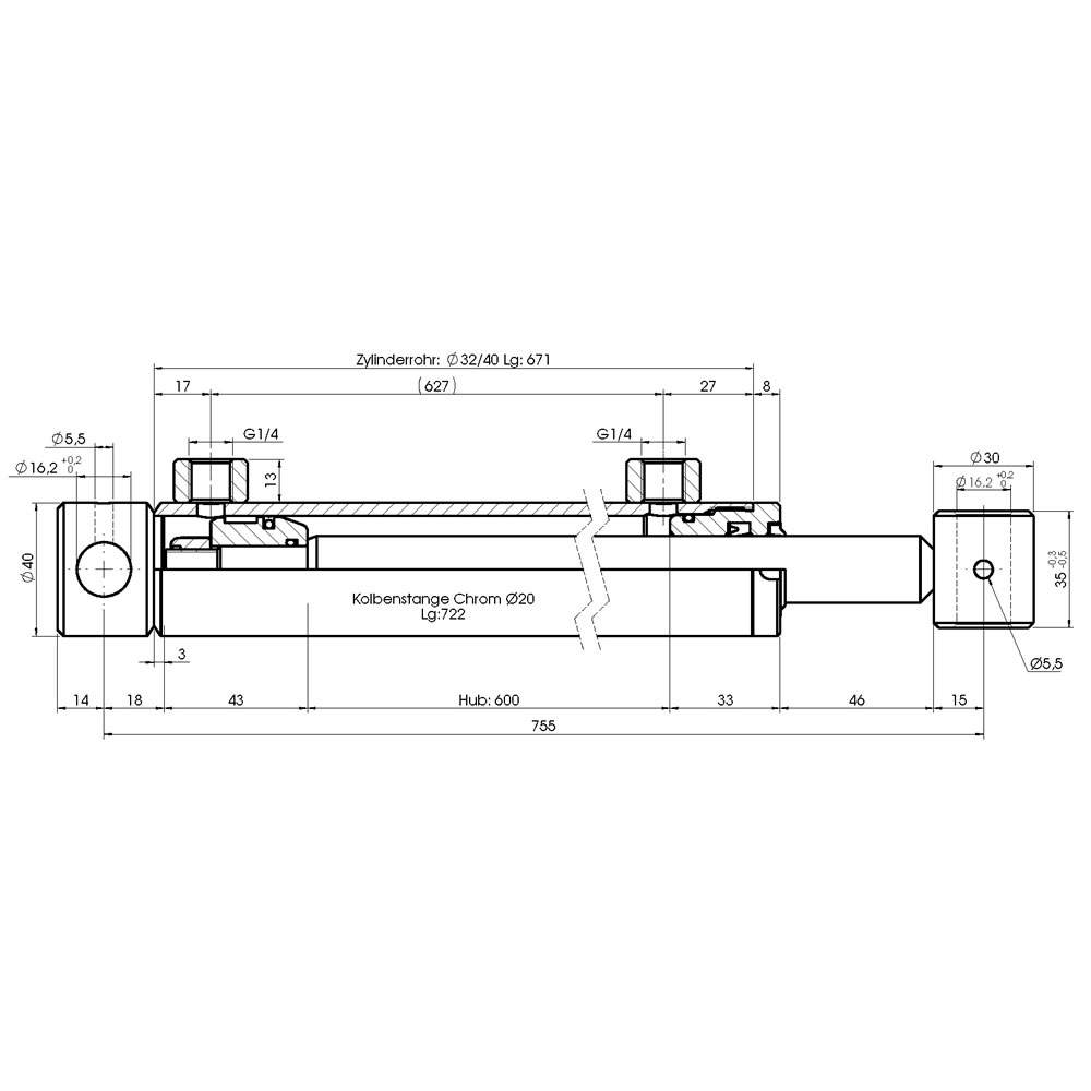 Hydraulikzylinder doppeltwirkend - Hub 600mm, Druckkraft ca. 1,6 Tonnen, 200bar