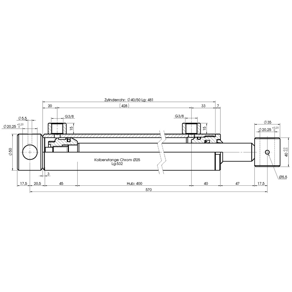 Hydraulikzylinder doppeltwirkend - Hub 400mm, Druckkraft ca. 2,5 Tonnen, 200bar