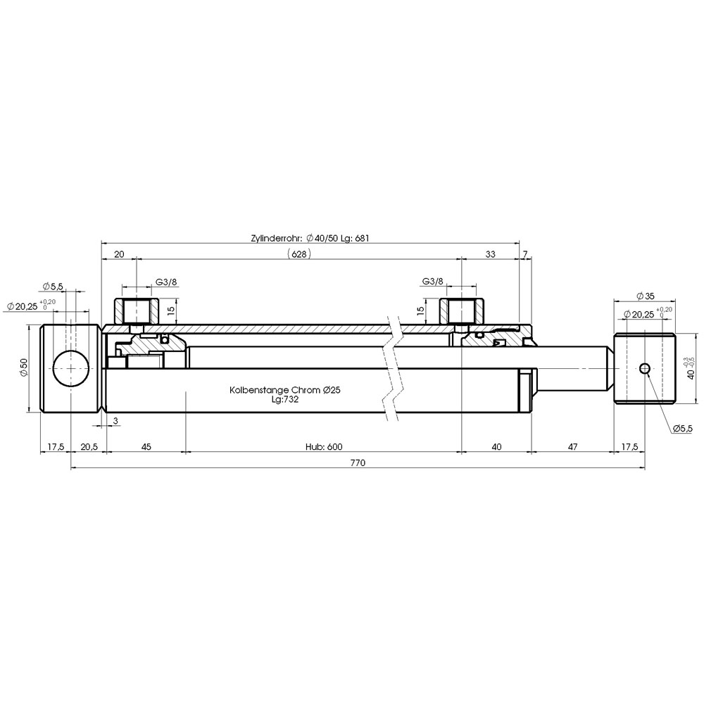 Hydraulikzylinder doppeltwirkend - Hub 600mm, Druckkraft ca. 2,5 Tonnen, 200bar