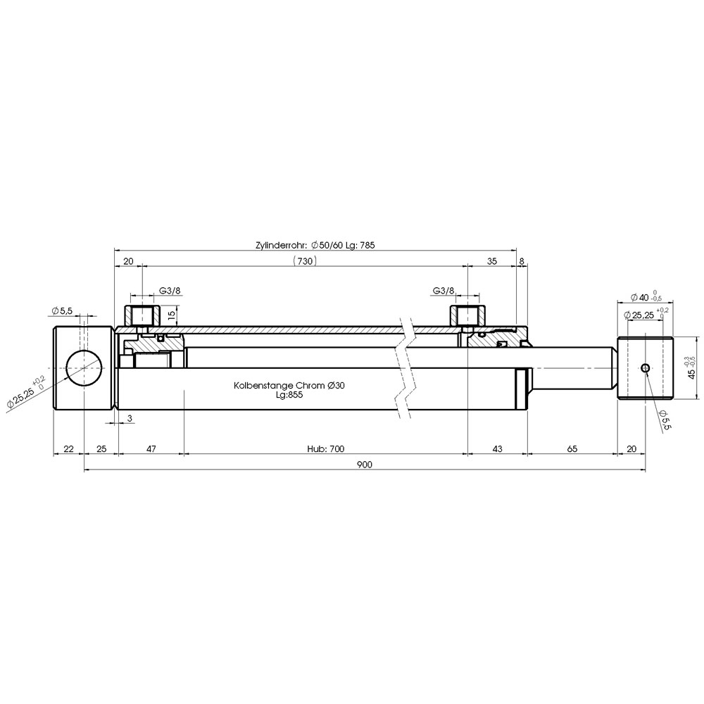 Hydraulikzylinder doppeltwirkend - Hub 700mm, Druckkraft ca. 3,9 Tonnen, 200bar