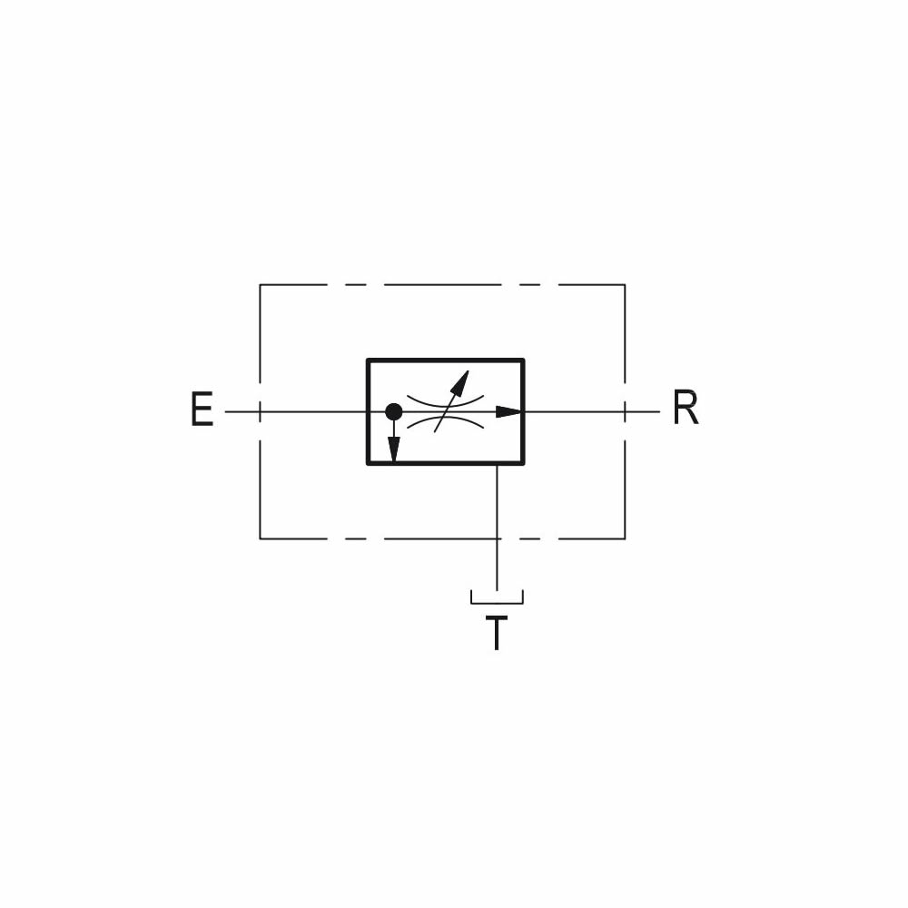 Der Stromregler ermöglicht die Bereitstellung eines vorwählbaren Konstantvolumenstroms am Anschluss R. Der Konstantvolumenstrom ist weitgehend unabhängig vom Lastdruck und der Eingangsmenge. Der überschüssige Differenzstrom wird zum Anschluss T abgeleitet und ist nicht belastbar.