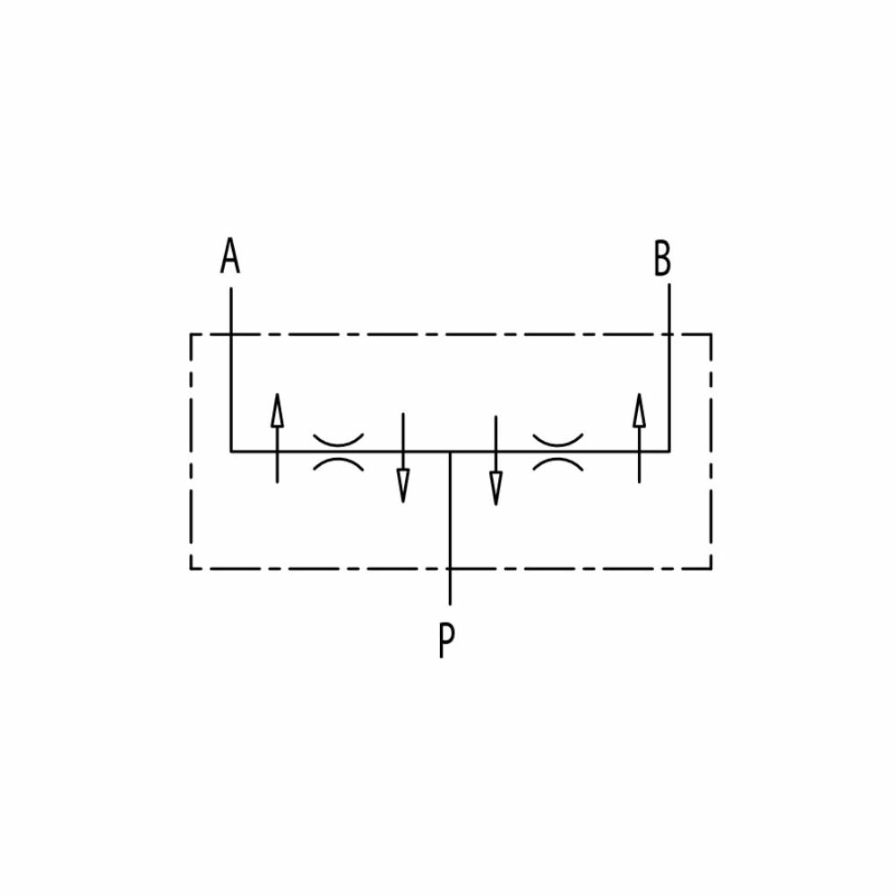 Dieses Stromteilventil teilt den eingehenden Ölstrom (V) in zwei gleich große abgehende Teilströme (C1 und C2) auf, unabhängig vom Lastdruck. Bei Änderung der Durchflussrichtung des Ölstroms werden die Teilströme (C1 und C2) wieder im gleichen Verhältnis addiert.