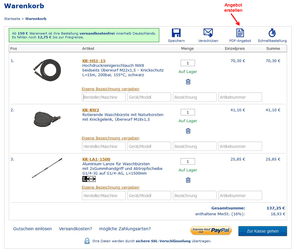 Sie benötigen vorab ein Angebot? Dann nutzen Sie unseren Angebotsgenerator. Füllen Sie den Warenkorb und klicken dann auf PDF-Angebot. Das Angebot wird Ihnen direkt zum Download zur Verfügung gestellt oder als Email zugesandt.