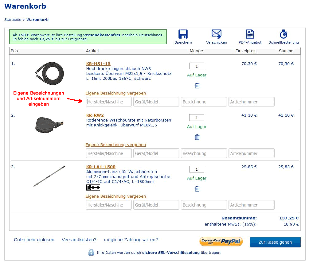 Sie haben eigene Artikelnummern und Bezeichnungen für die von Ihnen bestellten Artikel? Geben Sie diese direkt im Warenkorb an. Wir drucken Ihre Angaben auf Rechnung, Label und Verpackungen.