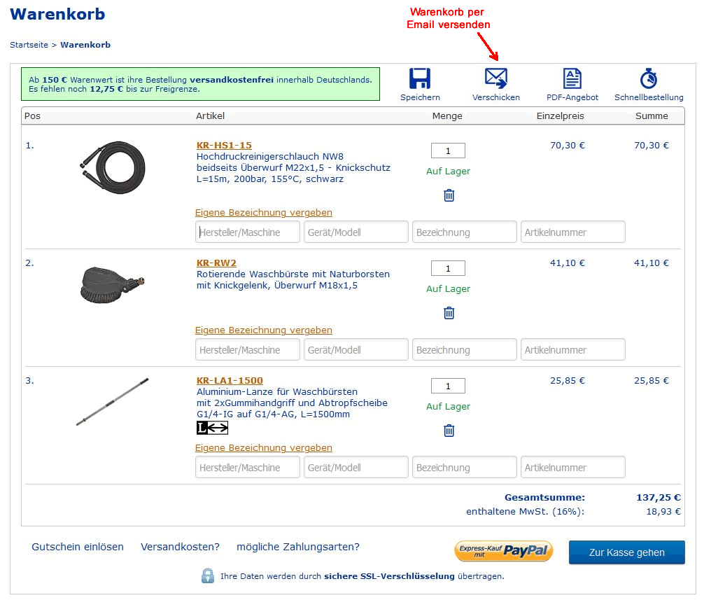 Teilen Sie Ihren gefüllten Warenkorb mit anderen. Senden Sie interessante Angebote an Geschäftspartner oder Freunde.