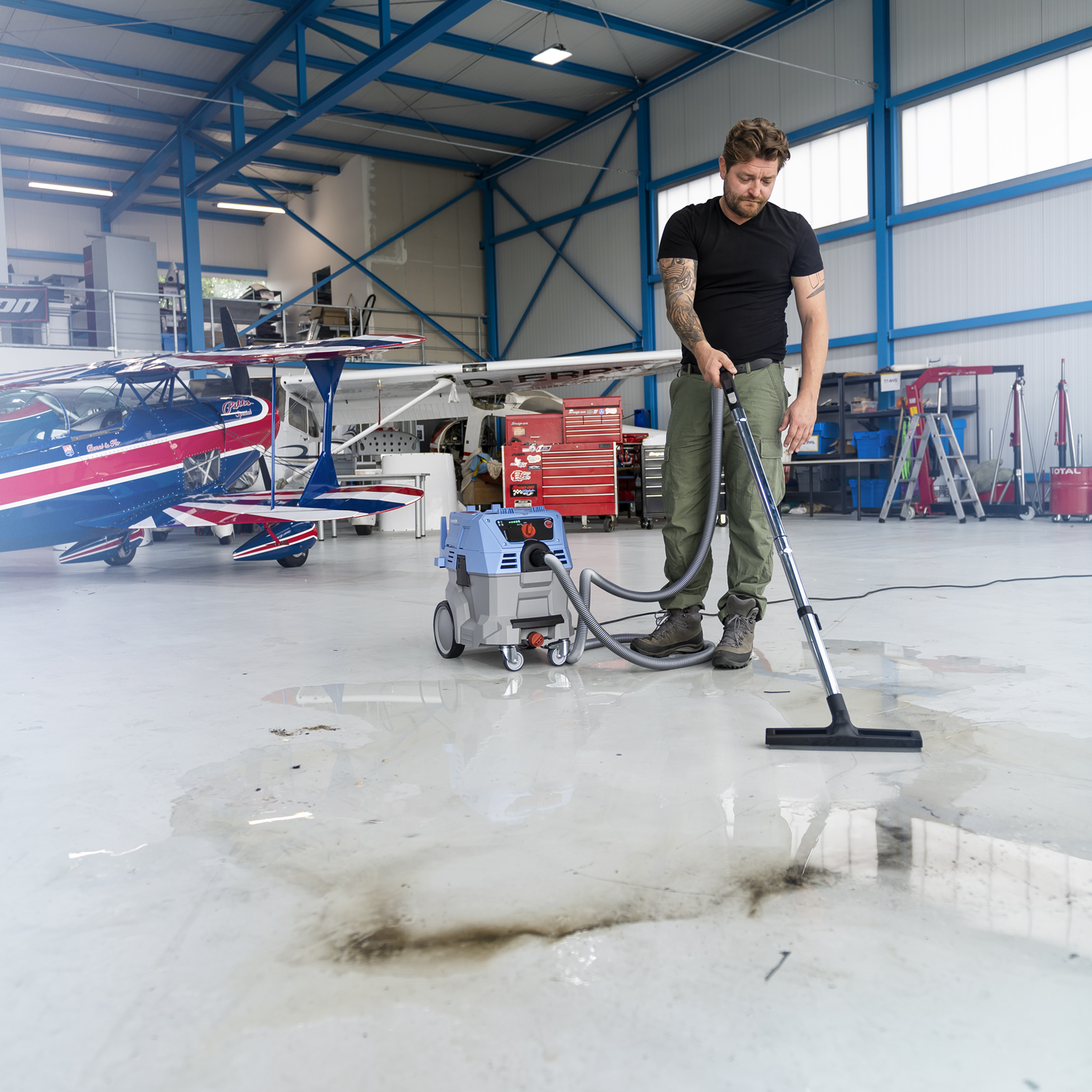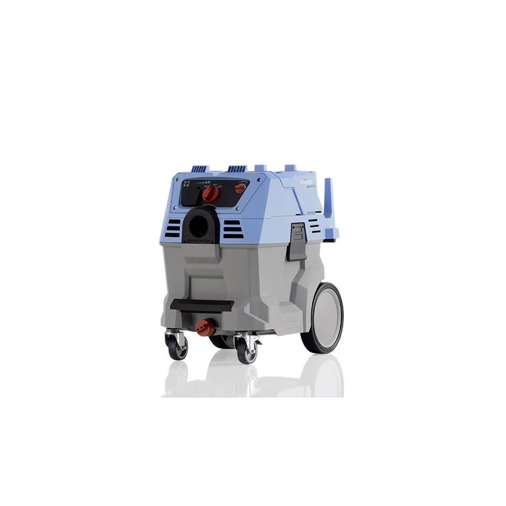 Kompakter, mobiler Industriestaubsauger mit automatischem Anlauf, Abschaltautomatik beim Nasssaugen und großer Ablassschraube.