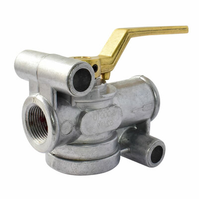 Der Absperrhahn wird vorzugsweise in Zweikreisbremsanlagen unmittelbar am Kupplungskopf der Vorratsleitung (rot) eingebaut. Er findet im Allgemeinen Verwendung in Druckluftanlagen oder auch stationären Systemen, in welchen ein Teil der Leitung entlüftbar sein muss. Er kann in einer beliebigen Stellung in die Leitung eingebaut werden.