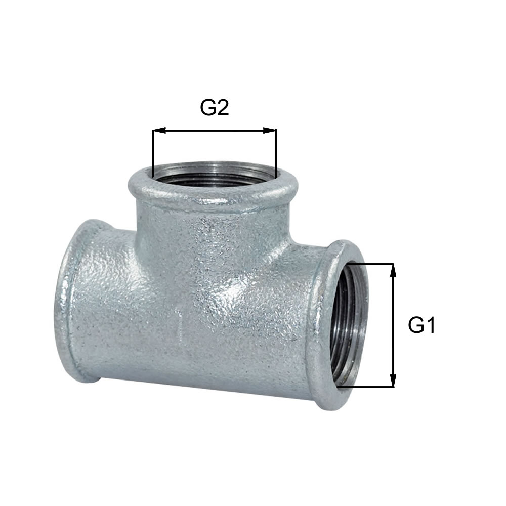 T-Stück, reduziert, Temperguss, verzinkt, Innengewinde 1/2" und 3/8" #130