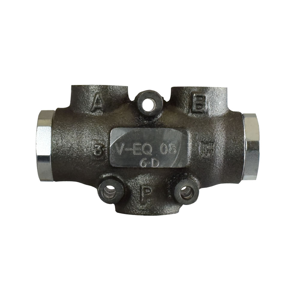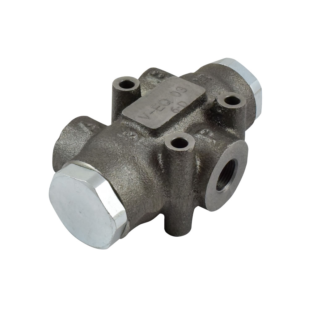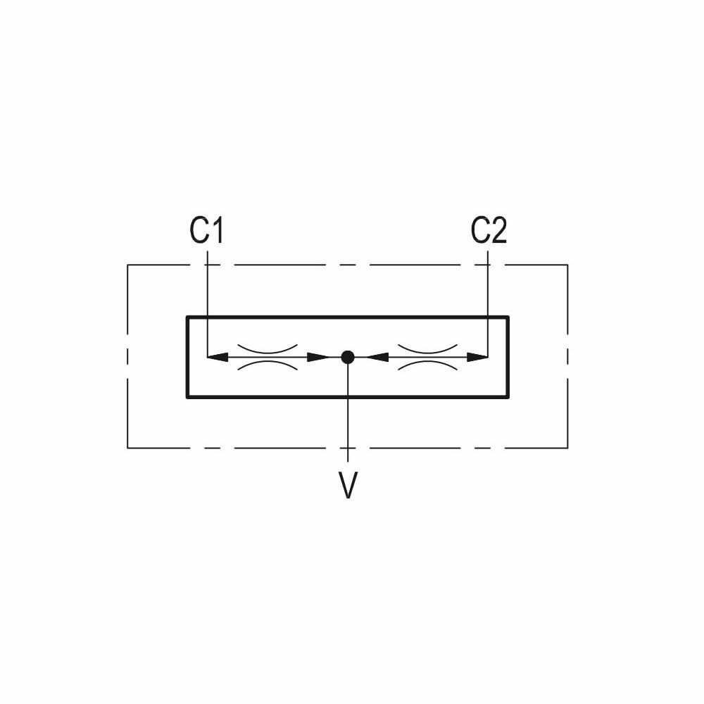 Dieses Stromteilventil teilt den eingehenden Ölstrom (V) in zwei gleich große abgehende Teilströme (C1 und C2) auf, unabhängig vom Lastdruck. Bei Änderung der Durchflussrichtung des Ölstroms werden die Teilströme (C1 und C2) wieder im gleichen Verhältnis addiert.