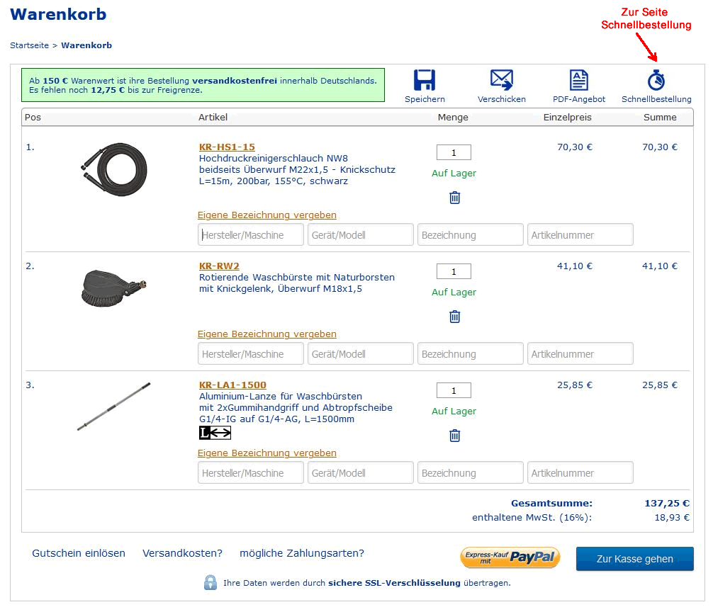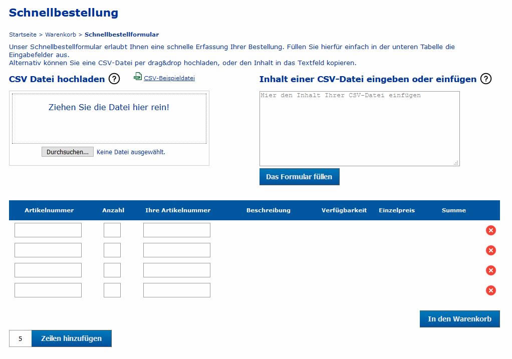 Nutzen Sie unsere Seite für Schnellbesteller. Tragen Sie Artikelnummern in das Schnellbestellformular ein, laden Sie eine CSV-Datei hoch oder kopieren Sie den Inhalt der CSV-Datei in das entsprechende Feld.