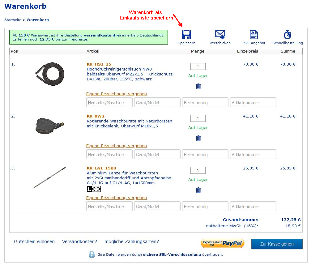 Speichern Sie Ihren Warenkorb und greifen später darauf zu. Unter dem Punkt "Einkaufslisten" werden Ihre Warenkörbe gespeichert und können hier verwaltet werden.