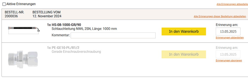 Für alle anderen Artikel erfolgt standardmäßig keine Erinnerung. Als registrierter Kunde können Sie die Erinnerungen jedoch